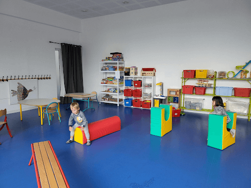 Souvent, c’est dans notre grande salle de motricité, avec des ballons, des cerceaux, des grosses structures en mousse pour des parcours… et parfois dans la cour pour faire des jeux collectifs, des slaloms avec les vélos, les trottinettes, les échasses.